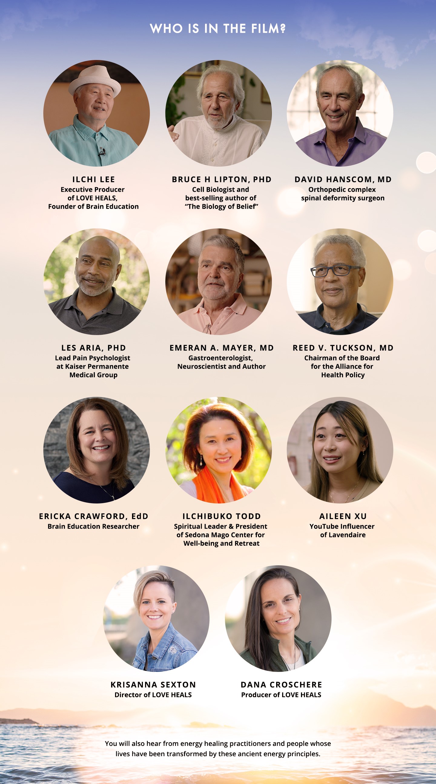Based on the teachings of the founder of Body & Brain, Ilchi Lee, comes LOVE HEALS, a documentary exploring how a 10,000-year-old mind-body principle called Water Up Fire Down could be the secret to healing. The documentary features leading medical and scientific experts including Bruce Lipton, Ph.D., David Hanscom, MD, and Les Aria, Ph.D., and world-renowned energy healing practitioners, and explores the questions: What does it mean to truly heal? And does this wisdom have the power to change our world?